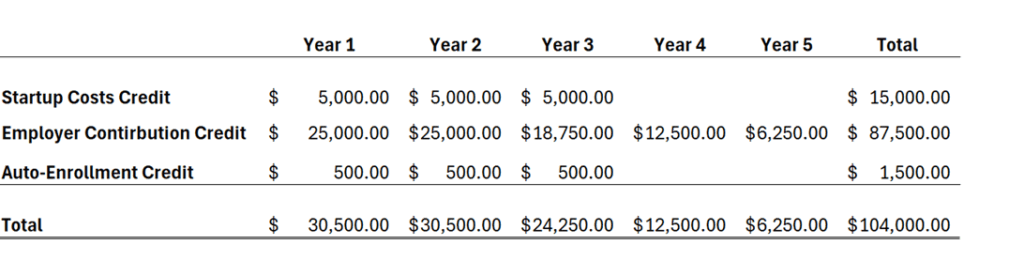 The combination of these incentives can be compelling. For an employer with 25 non-highly compensated employees (NHCE employees), that incurs $5,000 in plan start-up costs, with an employer contribution of $1,000 per employee and auto-enrollment, would receive up to $5,500 per year (or $16,500 over the first three years). Over a five-year period, this would result in a $87,500 tax benefit with a total savings of $104,000. See below for an illustration of the credit savings.