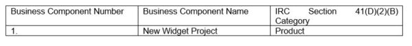 The best practice example provided in the IRS FAQs to satisfy item one includes a table that has the business component number, project name, and the IRC Section 41(D)(2)(B) defined business component like the example below.